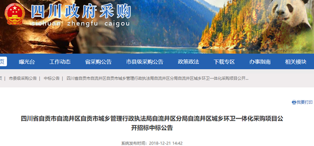 四川省自貢市自流井區(qū)城鄉(xiāng)環(huán)衛(wèi)一體化采購項(xiàng)目發(fā)布中標(biāo)公告,昌邑市康潔環(huán)衛(wèi)工程有限公司成為中標(biāo)的社會資本方,中標(biāo)金額為3437萬/年,服務(wù)期限為8年,期限內(nèi)合同總金額達(dá)2.75億。