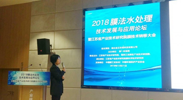 這次“2018膜法水處理技術(shù)發(fā)展與應(yīng)用論壇暨江蘇省產(chǎn)業(yè)技術(shù)研究院膜技術(shù)轉(zhuǎn)移大會”,來自金正環(huán)保的研發(fā)總監(jiān),苗晶博士對煙臺金正環(huán)保做了簡要介紹,著重介紹了金正環(huán)保在高難廢水處理領(lǐng)域所擁有的特有技術(shù)、設(shè)備、及實際案例。在上游膜材料方面,著重介紹了金正環(huán)保在膜材料方面已取得的進(jìn)展,包括低壓納濾膜、中空纖維納濾膜、雜化膜材料等。