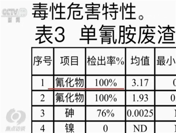 由清華大學(xué)亞洲太平洋地區(qū)危險(xiǎn)廢物管理培訓(xùn)與技術(shù)轉(zhuǎn)讓中心出具的具有法律效力的檢測報(bào)告中稱,這些的單氰胺廢渣,無機(jī)氰化物檢出率為100%,50個樣品中有11個氰化物浸出毒性超標(biāo),最大值超標(biāo)4倍。這就是說,這批廢渣已經(jīng)不是一般工業(yè)固體廢棄物,而屬于危險(xiǎn)工業(yè)固體廢棄物,建議歸類為“HW38有機(jī)氰化物廢物”。