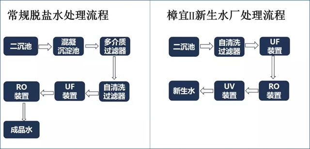 圖3 常規(guī)脫鹽水處理流程(左)與樟宜Ⅱ新生水廠處理流程(右)比較