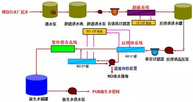 本項目采用了超濾、反滲透、UV殺菌三段工藝(工藝流程如圖2所示)。原水是樟宜污水廠二級生化處理出水,其主要污染物為懸浮顆粒物、有機污染物、溶解性無機物、細(xì)菌、病毒等。超濾工藝段主要目的是降低水的濁度,去除水中的懸浮顆粒物、大分子有機物和細(xì)菌等。反滲透工藝段采用過濾孔徑小于1納米的反滲透膜,去除各種小分子無機鹽、有機物和病毒。UV殺菌段進一步殺滅水中殘留的致病菌和病毒,最終成品水進入新生水儲罐,由新加坡公用事業(yè)局進行統(tǒng)一調(diào)配。反滲透系統(tǒng)采用一級二段式,一段反滲透的濃水再經(jīng)過二段反滲透,進一步回收淡水,在一段反滲透和二段反滲透之間增加能量回收裝置,達(dá)到節(jié)能目的。