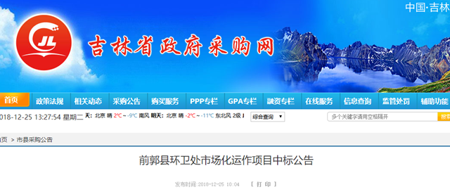吉林省前郭縣環(huán)衛(wèi)處市場化運作項目發(fā)布中標公告,長沙中聯(lián)重科環(huán)境產(chǎn)業(yè)有限公司成為中標的社會資本方,中標金額為2815.35萬/年,服務期限10年,期限內(nèi)項目總金額達2.82億。