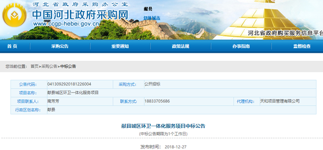 2018年12月27日,河北省獻縣城區(qū)環(huán)衛(wèi)一體化服務(wù)項目發(fā)布中標公告。錦江生態(tài)斬獲A包,中標金額為1036.33萬/年,服務(wù)期限3年。