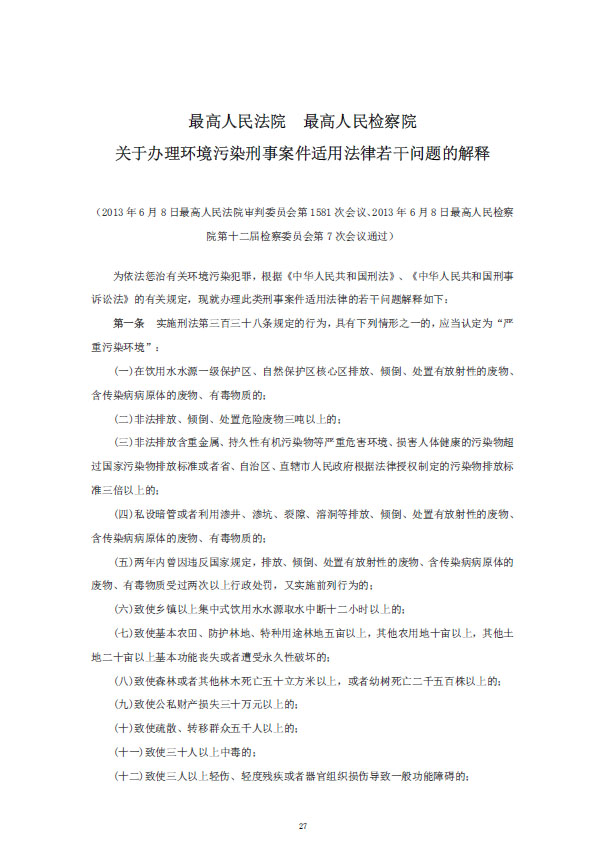 《最高人民法院、最高人民檢察院關(guān)于辦理環(huán)境污染刑事案件適用法律若干問(wèn)題的解釋》已于2016年11月7日由最高人民法院審判委員會(huì)第1698次會(huì)議、2016年12月8日由最高人民檢察院第十二屆檢察委員會(huì)第58次會(huì)議通過(guò),現(xiàn)予公布,自2017年1月1日起施行。