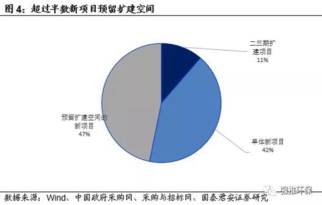 全新項目中,單體項目111個,占比47%;剩余124個項目已預(yù)留二期(三期)擴建場地或為二期(三期)擴建項目,側(cè)面反映項目方已考慮到未來新增處置需求的增長。