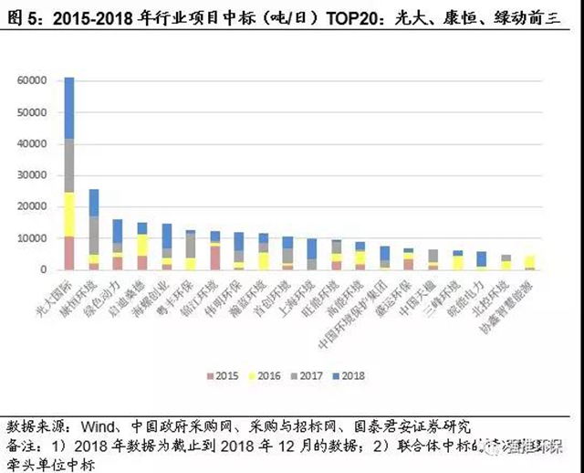 新增中標(biāo)項目向龍頭公司集中。分公司來看,2015-2018年行業(yè)新增項目總產(chǎn)能前三的公司分別為光大國際、康恒環(huán)境、綠色動力,分別占有新增中標(biāo)項目總量的22%、9%、6%。