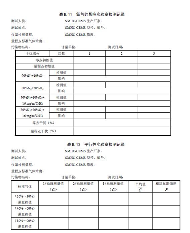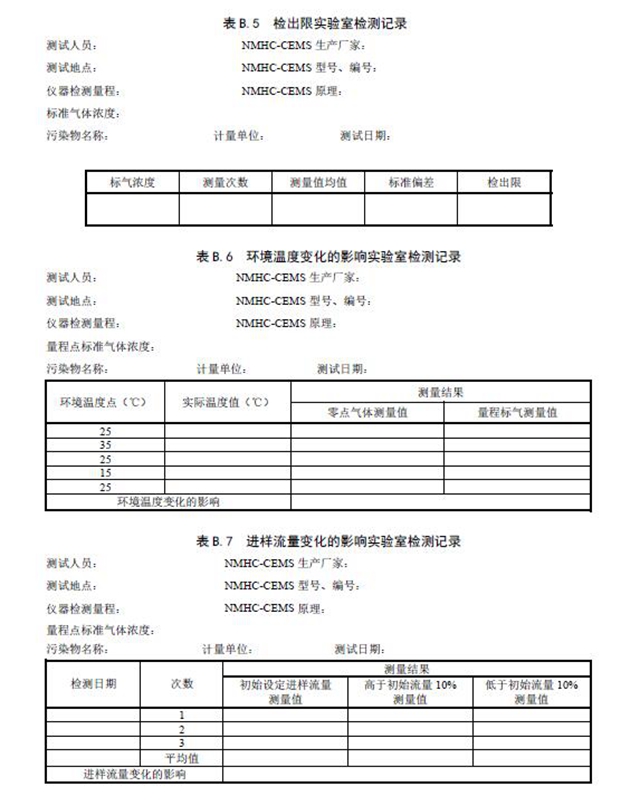 固定污染源廢氣NMHC-CEMS 實(shí)驗(yàn)室檢測項(xiàng)目見表3 和表4,廢氣參數(shù)現(xiàn)場檢測項(xiàng)目見表5。相關(guān)記錄表格見附錄B。