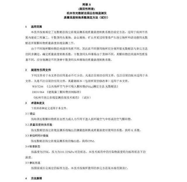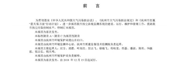 為貫徹落實(shí)國(guó)務(wù)院《打贏藍(lán)天保衛(wèi)戰(zhàn)三年行動(dòng)計(jì)劃》和《杭州市“清潔排放區(qū)”建設(shè)暨大氣污染防治2018年實(shí)施計(jì)劃》加強(qiáng)揚(yáng)塵監(jiān)管,安裝在線監(jiān)測(cè)和視頻監(jiān)控設(shè)備的工作要求,規(guī)范我市揚(yáng)塵在線監(jiān)測(cè)系統(tǒng)的建設(shè)、維護(hù)和管理工作,進(jìn)一步提高我市揚(yáng)塵污染防治水平。杭州市環(huán)境監(jiān)測(cè)中心站和杭州市質(zhì)量技術(shù)監(jiān)督檢測(cè)院經(jīng)過(guò)廣泛調(diào)研,結(jié)合我市實(shí)際,編制完成了《杭州市揚(yáng)塵在線監(jiān)測(cè)系統(tǒng)技術(shù)規(guī)范(試行)》,并在征求相關(guān)部門(mén)意見(jiàn)的基礎(chǔ)上,已進(jìn)行修改完善,現(xiàn)予以發(fā)布。