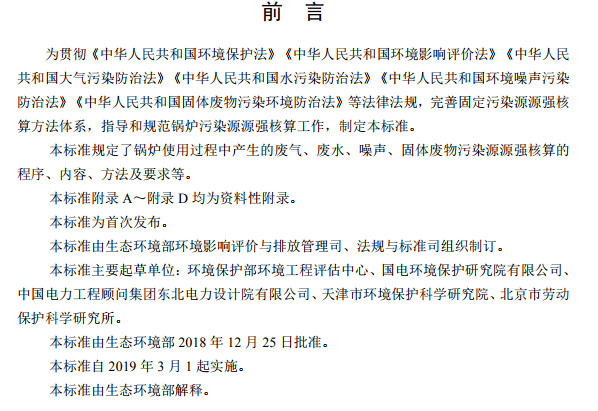 為貫徹《中華人民共和國(guó)環(huán)境保護(hù)法》《中華人民共和國(guó)環(huán)境影響評(píng)價(jià)法》《中華人民共和國(guó)大氣污染防治法》《中華人民共和國(guó)水污染防治法》《中華人民共和國(guó)環(huán)境噪聲污染防治法》《中華人民共和國(guó)固體廢物污染環(huán)境防治法》等法律法規(guī),完善固定污染源源強(qiáng)核算方法體系,指導(dǎo)和規(guī)范鍋爐污染源源強(qiáng)核算工作,制定本標(biāo)準(zhǔn)。本標(biāo)準(zhǔn)規(guī)定了鍋爐使用過(guò)程中產(chǎn)生的廢氣、廢水、噪聲、固體廢物污染源源強(qiáng)核算的程序、內(nèi)容、方法及要求等。本標(biāo)準(zhǔn)附錄A~附錄D均為資料性附錄。本標(biāo)準(zhǔn)為首次發(fā)布。