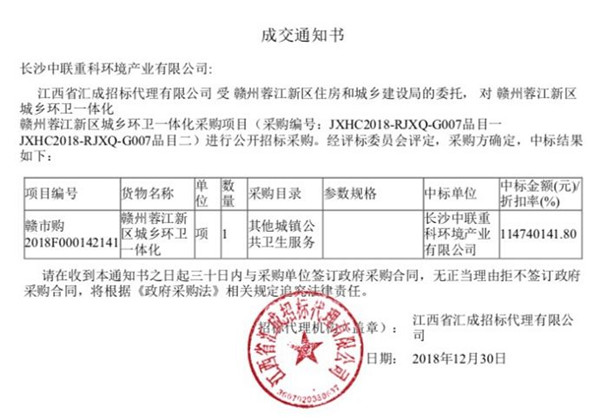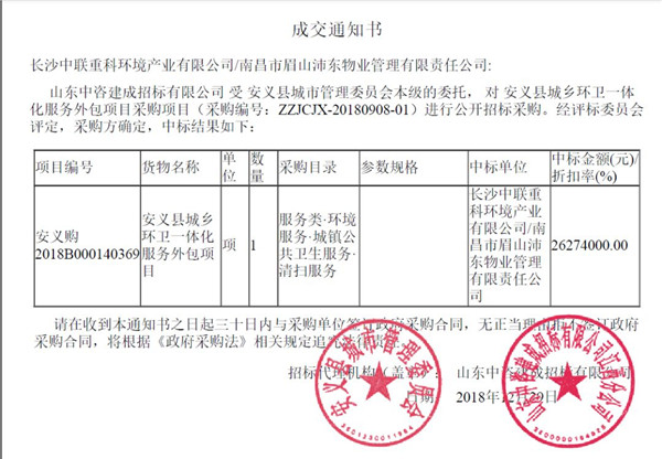 2018年12月29日,中聯(lián)環(huán)境成功中標江西省安義縣城鄉(xiāng)環(huán)衛(wèi)一體化服務(wù)項目,中標總金額約為2.38億元,服務(wù)期限5+3年,單年度服務(wù)費2627.4萬元。