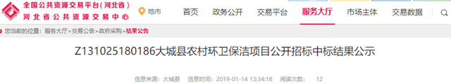 2019年1月14日,河北省大城縣農(nóng)村環(huán)衛(wèi)保潔項(xiàng)目發(fā)布中標(biāo)結(jié)果公示,啟迪桑德環(huán)境資源股份有限公司獲得二標(biāo)段,中標(biāo)金額為2254.93萬(wàn)/年,服務(wù)期限為3年。