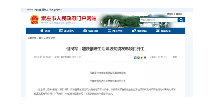 而根據(jù)政府官媒報(bào)道顯示,2018年8月29日,崇左市召開(kāi)生活垃圾焚燒發(fā)電項(xiàng)目洽談會(huì),市長(zhǎng)何良軍就推進(jìn)崇左生活垃圾焚燒發(fā)電項(xiàng)目建設(shè)與中國(guó)電力清潔能源發(fā)展有限公司副總裁柴茂一行進(jìn)行洽談,旨在加快推進(jìn)生活垃圾焚燒發(fā)電項(xiàng)目開(kāi)工。
