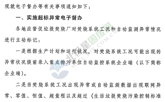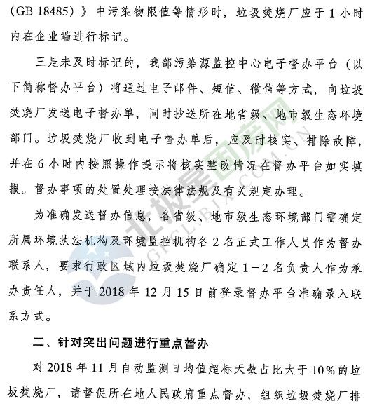日前生態(tài)環(huán)境部辦公廳下發(fā)了加急通知:《關于實施生活垃圾焚燒發(fā)電廠煙氣排放自動監(jiān)控電子督辦等有關事項的通知》,通知提到,即日起(發(fā)文之日起)生態(tài)環(huán)境部將對生活垃圾焚燒發(fā)電廠實施超標異常電子督辦。各地應督促垃圾焚燒廠對焚燒系統(tǒng)公開和自動監(jiān)測異常情況進行主動標記。針對突出問題進行重點督辦,對2018年11月自動監(jiān)測日均值超標天數(shù)占比大于10%的垃圾焚燒發(fā)電廠,請督促所在地人民政府重點督辦,組織垃圾焚燒廠排查超標原因、制定并落實整改措施。