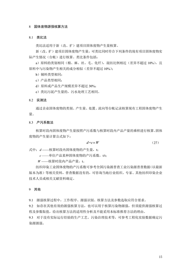 為貫徹《中華人民共和國環(huán)境保護(hù)法》《中華人民共和國環(huán)境影響評(píng)價(jià)法》《中華人民共和國大氣污染防治法》《中華人民共和國水污染防治法》《中華人民共和國環(huán)境噪聲污染防治法》《中華人民共和國固體廢物污染環(huán)境防治法》等法律法規(guī),完善固定污染源源強(qiáng)核算方法體系,指導(dǎo)和規(guī)范紡織印染工業(yè)污染源源強(qiáng)核算工作,制定本標(biāo)準(zhǔn)。本標(biāo)準(zhǔn)規(guī)定了紡織印染工業(yè)廢水、廢氣、噪聲、固體廢物污染源強(qiáng)核算的程序、內(nèi)容、方法及要求等。本標(biāo)準(zhǔn)附錄 A 為資料性附錄。本標(biāo)準(zhǔn)為首次發(fā)布。