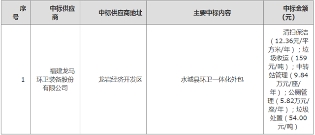 貴州水城縣城鄉(xiāng)環(huán)衛(wèi)項(xiàng)目評(píng)標(biāo)工作結(jié)束,龍馬環(huán)衛(wèi)中標(biāo),中標(biāo)金額:清掃保潔(12.36元/平方米/年);垃圾收運(yùn)(159元/噸);中轉(zhuǎn)站管理(9.84萬(wàn)元/座/年);公廁管理(5.82萬(wàn)元/座/年);垃圾處置(54.00元/噸),項(xiàng)目采購(gòu)預(yù)算高達(dá)12億元。