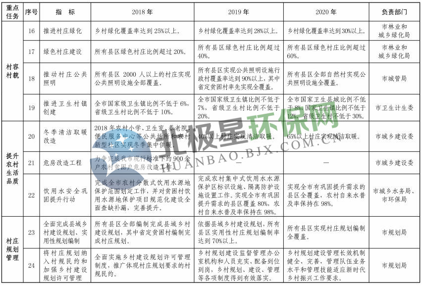 (三)行動(dòng)目標(biāo)。到2020年,全市農(nóng)村人居環(huán)境明顯改善,實(shí)施鄉(xiāng)村振興戰(zhàn)略取得重要階段性成效?;緦?shí)現(xiàn)村莊規(guī)劃編制、生活垃圾收運(yùn)處置、無害化衛(wèi)生廁所改造全覆蓋,生活污水處理率大幅提高,生態(tài)環(huán)境質(zhì)量顯著提升,村民環(huán)境與健康意識(shí)普遍增強(qiáng),管護(hù)長(zhǎng)效機(jī)制初步建立,生活環(huán)境干凈整潔有序,廣大農(nóng)村呈現(xiàn) “生產(chǎn)美、生活美、生態(tài)美”的全新面貌。