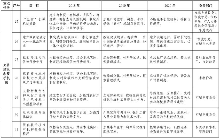 (一)推進(jìn)農(nóng)村垃圾綜合治理。在實(shí)現(xiàn)城鄉(xiāng)環(huán)衛(wèi)一體化全覆蓋的基礎(chǔ)上,推行農(nóng)村生活垃圾收運(yùn)處理市場(chǎng)化運(yùn)作、減量化處理、資源化利用、數(shù)字化管理、法制化保障的工作機(jī)制,所有村莊實(shí)現(xiàn)農(nóng)村生活垃圾無害化處理。