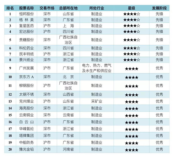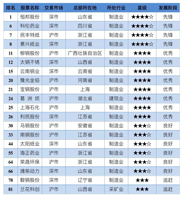 2.上市公司排名前20的企業(yè)名單。上市公司環(huán)境信息披露排名前十的企業(yè):恒邦股份、格林美、復(fù)星醫(yī)藥、宏達股份、貴糖股份、科倫藥業(yè)、民豐特紙、景興紙業(yè)、廣州發(fā)展、京東方A,其中前8家評級為四星半級,后兩家被評為四星級。