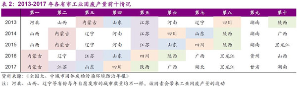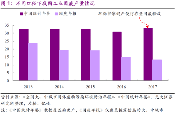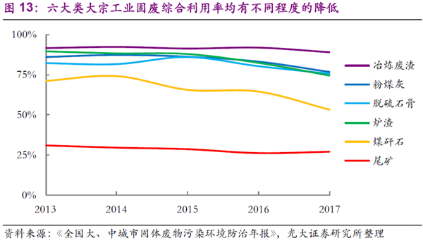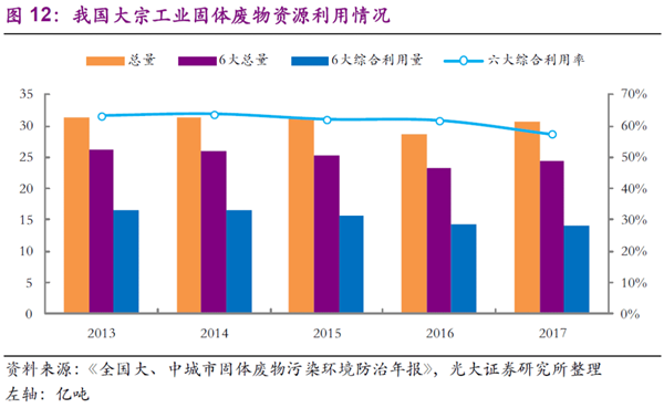 從《中國統(tǒng)計(jì)年鑒》數(shù)據(jù)中我們可以得出同樣的趨勢。2013年起我國一般工業(yè)固體廢物產(chǎn)生量為32.77億噸,到2016年已減少至30.92億噸。2017年我國一般工業(yè)固廢產(chǎn)生量突然增長至33.16萬噸,我們認(rèn)為其主要原因是2017年的環(huán)保督察趨嚴(yán)使得大量存量固體釋放進(jìn)而拉高當(dāng)年產(chǎn)量,但是工業(yè)固廢減量化的大趨勢是不改的。