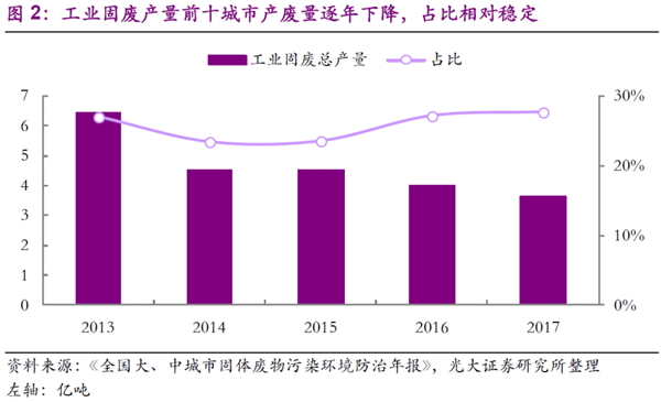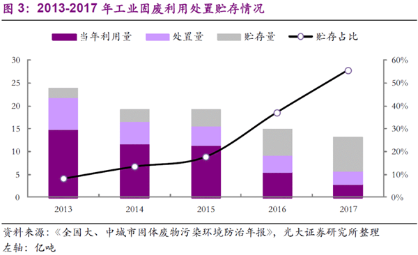 我國在“十二五”規(guī)劃中提出工業(yè)固廢要大力推行減量化處理原則,2013年起我國的工業(yè)固廢產(chǎn)量呈下降趨勢。雖然2017年由于環(huán)保督察趨嚴(yán)的因素導(dǎo)致大量存量固廢釋放,但工業(yè)固廢減量化的大趨勢不改。另一方面,我國歷年大、中城市的工業(yè)固廢貯存量占比已從2013年的8%提高至2017年的56%,工業(yè)固廢利用處置的占比仍需進(jìn)一步提高。