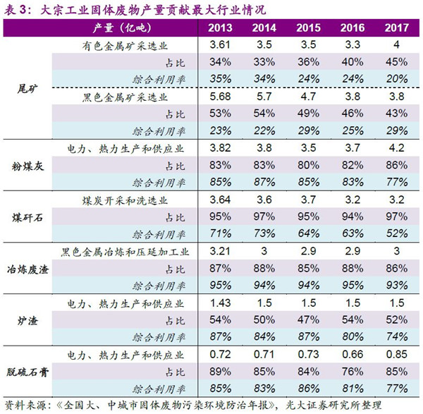 另一方面,我國大宗工業(yè)固體廢物資源利用情況相對穩(wěn)定,重點(diǎn)發(fā)表調(diào)查工業(yè)企業(yè)的一般固體廢物產(chǎn)生量穩(wěn)中有降,六大類大宗工業(yè)固廢(尾礦、粉煤灰、煤矸石、冶煉廢渣、爐渣、脫硫石膏)的產(chǎn)量占比相對穩(wěn)定,但各自的綜合利用率均有一定程度的下降;而各自的產(chǎn)量最大貢獻(xiàn)行業(yè)的產(chǎn)量和綜合利用率總體來看保持穩(wěn)定。