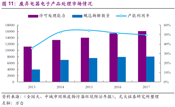 資源化廢物利用方面,我國廢棄電器電子產(chǎn)品處理市場穩(wěn)健增長,截止2017年底,共109家企業(yè)納入廢棄電器電子產(chǎn)品處理基金補(bǔ)貼企業(yè)名單,合計(jì)年處理能力達(dá)1.61億臺,比2013年的1.12億臺增長44%。同時,規(guī)范拆解廢棄電器電子產(chǎn)品的數(shù)量也由2013年的3987萬臺增長到2017年的7995萬臺,產(chǎn)能利用率也有一定程度的增長,行業(yè)正逐步朝著規(guī)范化、集中化的趨勢發(fā)展。