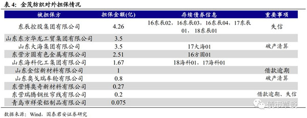 18年金茂自身主營業(yè)務承壓的情況下,巨額對外擔保的風險暴露,導致企業(yè)流動性緊張,最終出現違約。截至2018年6月末,金茂紡織對外擔保余額為19.33億元,占當期期末凈資產的19.23%,擔保規(guī)模較大。被擔保企業(yè)主要是位于山東省東營市的民營企業(yè),區(qū)域較為集中,且所處行業(yè)集中在周期性較強的有色金屬、化工等行業(yè),在宏觀經濟增速放緩的背景下,代償風險大,金茂紡織的對外擔保有極高的風險傳導性。被擔保企業(yè)山東大海集團有限公司和奧戈瑞車輪集團有限公司的信用風險已經暴露:奧戈瑞于今年7月10日宣布進入破產重組階段,公司為其擔保0.8億;11月26日,山東大海向東營法院申請重整,金茂紡織為其擔保3.5億元。金茂紡織在尚且自顧不暇的情況下,又受巨額對外擔保的拖累,資金鏈斷裂,企業(yè)無法正常經營運轉,于在11月26日宣告破產重整。