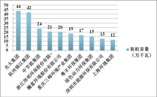 當前我國垃圾焚燒發(fā)電行業(yè)市場競爭主體主要為大型國資背景企業(yè)和優(yōu)秀民營企業(yè)。2016年裝機容量排名前10名的垃圾焚燒發(fā)電投資企業(yè)依次為中國光大國際有限公司(43.53萬千瓦)、杭州錦江集團(41.9萬千瓦)、中國節(jié)能集團(24.1萬千瓦)、浙江偉明環(huán)保股份有限公司(20.55萬千瓦)、瀚藍環(huán)境股份有限公司(20萬千瓦)、重慶三峰環(huán)境產(chǎn)業(yè)集團有限公司(18.6萬千瓦)、粵豐環(huán)保集團(16.8萬千瓦)、綠色動力環(huán)保集團股份有限公司(15.45萬千瓦)、深圳市能源環(huán)保有限公司(12.85千瓦)、上海環(huán)境集團(11.7萬千瓦)和北京控股有限公司(11.55萬千瓦),具體詳見圖6。