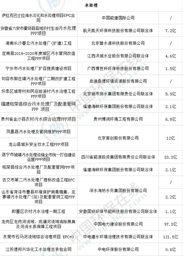 中標項目的大頭非水處理莫屬,更值得注意的是,中標金額普遍較大,更有33億的遂寧市城鎮(zhèn)污水處理設(shè)施全市統(tǒng)一打包建設(shè)運營PPP項目、97億的龍崗區(qū)龍崗河流域、觀瀾河流域消除黑臭及河流水質(zhì)保障工程項目、121億的東莞市石馬河流域綜合治理項目 EPC+O,振奮人心。