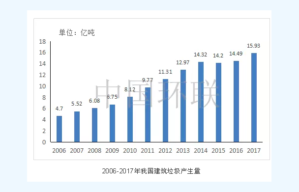 近年來(lái),我國(guó)城市化進(jìn)程不斷提速,新城區(qū)的建設(shè)與老城區(qū)的改造,制造了大量的建筑垃圾。根據(jù)中國(guó)環(huán)聯(lián)保守估計(jì)我國(guó)2017年共計(jì)產(chǎn)生建筑垃圾15.93億噸。結(jié)合住建部公布的最新規(guī)劃,到2020年我國(guó)建筑垃圾產(chǎn)生量將達(dá)到峰值,預(yù)計(jì)會(huì)突破30億噸。