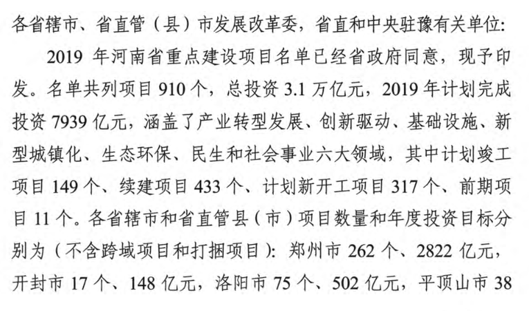 2月11日,河南省發(fā)改委發(fā)布《關(guān)于印發(fā)2019年河南省重點(diǎn)建設(shè)項(xiàng)目名單的通知》。名單共列項(xiàng)目910個(gè),總投資3.1萬億元,2019年計(jì)劃完成投資7939億元,涵蓋了產(chǎn)業(yè)轉(zhuǎn)型發(fā)展、創(chuàng)新驅(qū)動、基礎(chǔ)設(shè)施、新型城鎮(zhèn)化、生態(tài)環(huán)保、民生和社會事業(yè)六大領(lǐng)域18個(gè)行業(yè)。其中計(jì)劃竣工項(xiàng)目149個(gè)、續(xù)建項(xiàng)目433個(gè)、計(jì)劃新開工項(xiàng)目317個(gè)、前期項(xiàng)目11個(gè)。