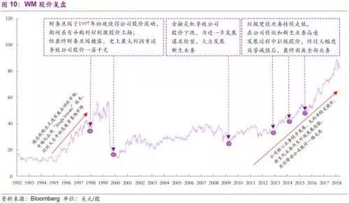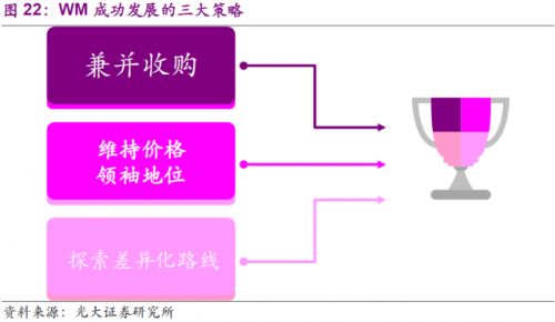 縱觀WM發(fā)展的歷史,它既享受到外部經(jīng)濟和行業(yè)高速發(fā)展所帶來的廣闊市場,也需經(jīng)歷經(jīng)濟危機和市場轉(zhuǎn)型所帶來的陣痛。公司為搶占市場份額,穩(wěn)固龍頭地位,實現(xiàn)股東最大化方面做出了多方面努力,制定了各類執(zhí)行策略以期達到目標,而我們認為其中最重要的是三項策略,也是我們將進一步細致分析的,即兼并收購,維持價格領(lǐng)袖地位,以及探索差異化路線。