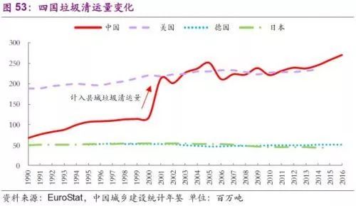 美國、日本、德國同為全球領(lǐng)先的發(fā)達國家,早在二十世紀90年代便實現(xiàn)了100%垃圾清運率,所以它們的垃圾產(chǎn)生量也是他們的垃圾清運量。美國垃圾清運量從二十世紀90年代起仍在持續(xù)增長,目前維持在2.3億噸左右;德國垃圾清運量偶有波動,基本維持在5千萬噸;日本垃圾清運量更是從1990年的5千萬噸減少到2015年的4千萬噸左右。中國垃圾清運量伴隨著經(jīng)濟高速發(fā)展,在2001年起計入縣城垃圾清運量后達到2億噸水平,總量和美國持平并在2012年實現(xiàn)超越,成為全球垃圾清運第一大國。