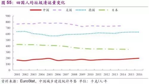 年度人均垃圾產(chǎn)生與清運量與經(jīng)濟發(fā)展水平正相關(guān)。美國常年保持在700千克/人?年以上,位居全球之首。德國稍次,近十年恢復(fù)到600千克/人?年水平。日本率先提出3R(減少原料、再利用、資源回收)的固廢處理標準并堅持執(zhí)行,近20年來人均垃圾清運量已減至300千克/人?年左右。中國雖然總垃圾清運量已位居全球第一,但人均垃圾清運量距其他三國尚有不小距離,隨著城鎮(zhèn)垃圾清運率的進一步提升,以及農(nóng)村垃圾產(chǎn)生及清運量的進一步提升,中國環(huán)衛(wèi)市場存在較大空間。