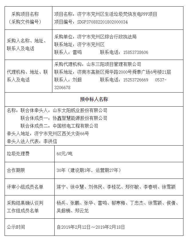 2019年春節(jié)過(guò)后,開(kāi)工的第二天,2月12日,從濟(jì)寧公共資源交易網(wǎng)獲悉,山東濟(jì)寧市兗州區(qū)生活垃圾焚燒發(fā)電PPP項(xiàng)目預(yù)中標(biāo)結(jié)果公示,山東太陽(yáng)紙業(yè)股份有限公司牽頭的,協(xié)鑫智慧能源股份有限公司與中國(guó)核電工程有限公司組成的聯(lián)合體中標(biāo),垃圾處理費(fèi)60元/噸。