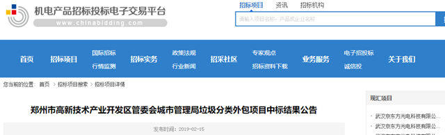 鄭州市高新技術(shù)產(chǎn)業(yè)開發(fā)區(qū)管委會(huì)城市管理局垃圾分類外包項(xiàng)目發(fā)布中標(biāo)結(jié)果公告,浙江聯(lián)運(yùn)環(huán)境工程股份有限公司獲得第四標(biāo)段。