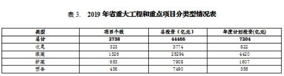 2019年共安排省重大工程和重點(diǎn)項(xiàng)目2738個(gè),總投資44466億元,2019年計(jì)劃投資7204億元。其中:收尾項(xiàng)目323個(gè),總投資3774億元,年度計(jì)劃投資822億元;續(xù)建項(xiàng)目1326個(gè),總投資25294億元,年度計(jì)劃投資4420億元;新建項(xiàng)目653個(gè),總投資7908億元,年度計(jì)劃投資1607億元;預(yù)備項(xiàng)目436個(gè),總投資7490億元,年度計(jì)劃投資355億元。