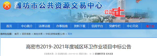 山東濰坊高密市2019-2021年度城區(qū)環(huán)衛(wèi)作業(yè)項(xiàng)目發(fā)布中標(biāo)公告,昌邑市康潔環(huán)衛(wèi)工程有限公司獲得三標(biāo)段,中標(biāo)金額792萬(wàn)。