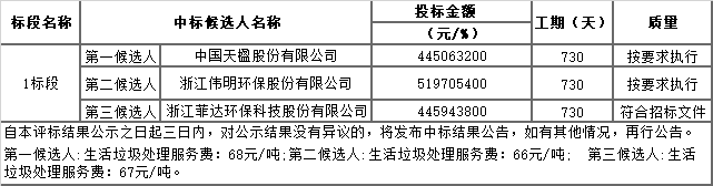 河南省項(xiàng)城市生活垃圾焚燒發(fā)電BOT項(xiàng)目發(fā)布中標(biāo)候選人公示,中國天楹股份有限公司排名第一,投標(biāo)金額4.45億,生活垃圾處理服務(wù)費(fèi)68元/噸。