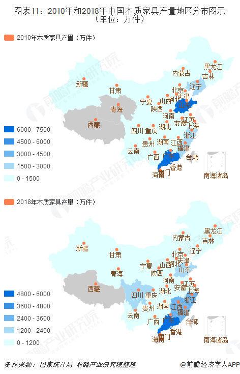 第一,部分地區(qū)木質(zhì)家具從無到有、從有到無;有中小木質(zhì)家具企業(yè)入駐青海,2018年產(chǎn)量達(dá)到1.02萬輛;內(nèi)蒙古和海南的木質(zhì)家具產(chǎn)業(yè)陸續(xù)遷出,2018年產(chǎn)量為零。