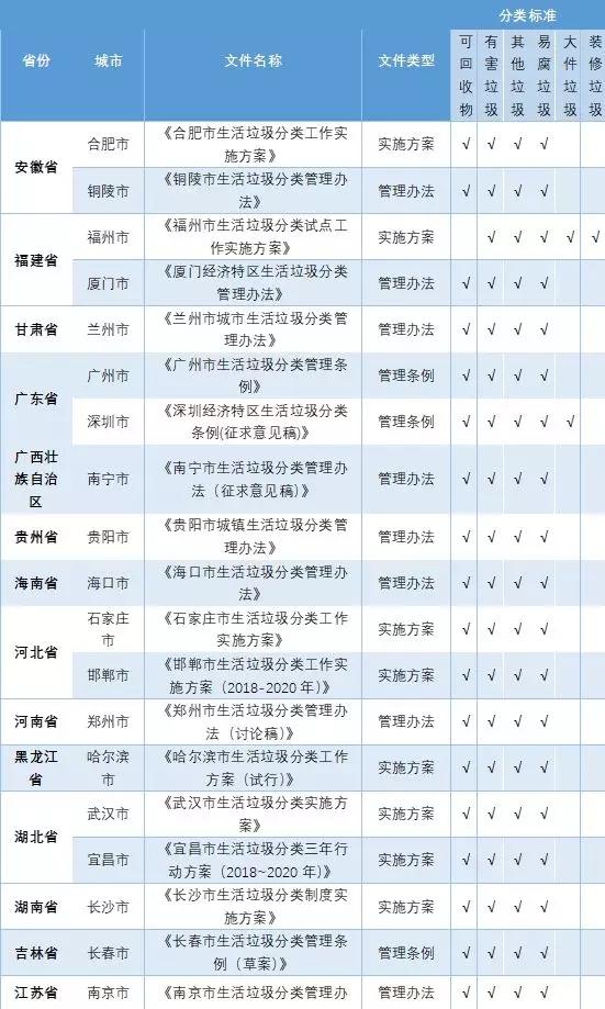 2017年底,住房城鄉(xiāng)建設(shè)部發(fā)布《關(guān)于加快推進(jìn)部分重點(diǎn)城市生活垃圾分類工作的通知》,要求2018年3月底前,46個(gè)重點(diǎn)城市要出臺(tái)生活垃圾分類管理實(shí)施方案或計(jì)劃行動(dòng),明確年度工作目標(biāo),量化工作任務(wù)。