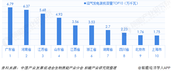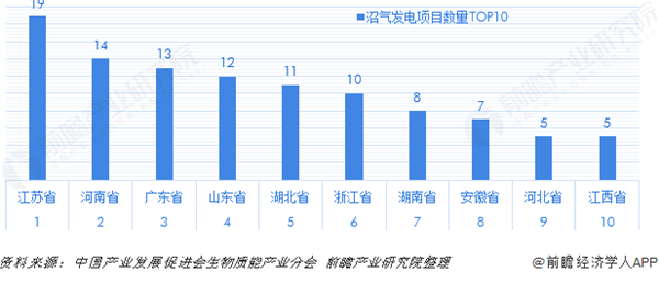 整體規(guī)模較小的沼氣發(fā)電項目擁有量最高的是江蘇省,項目數(shù)量達19個;排在第二名的是河南省,項目數(shù)量為14個;廣東省的項目數(shù)量為13個,排在第三位;山東、河北、浙江的項目數(shù)量均在10個以上,其余省市的項目數(shù)量較少。