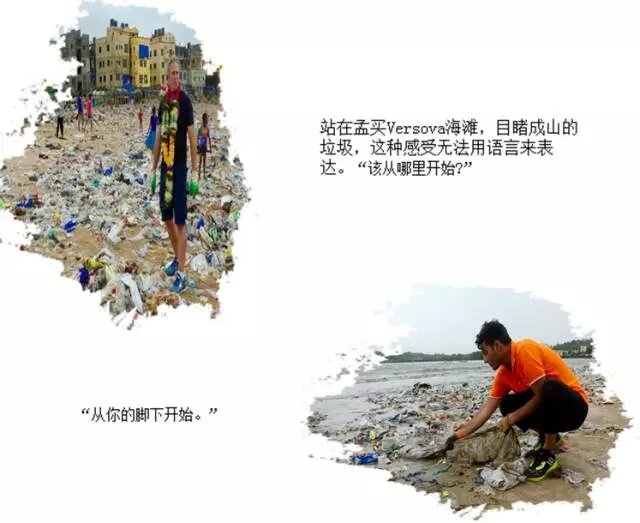 我不得不提醒自己,這里——是海灘——然而海灘的沙子深埋在垃圾和污物之下。這些垃圾有我的腳踝那么深,將我的腳面完全覆蓋。在舒適的家中看照片和親臨現(xiàn)場是完全不同的體驗。此時此刻,站在孟買Versova海灘,目睹成山的垃圾,面對著赤裸裸的真相,這種感受無法用語言來表達。該從哪里開始?