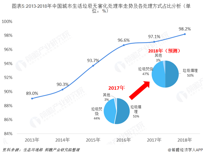 根據(jù)生態(tài)環(huán)境部數(shù)據(jù),2018年我國城市生活垃圾無害化處理率已接近100%,達到98.2%,其中垃圾填埋方式處理的生活垃圾比例預計較2017年有所下降,約為50%。由于土地資源緊缺,未來以填埋方式處理的生活垃圾比例將繼續(xù)下降,垃圾焚燒處理能力亟待不斷增強。