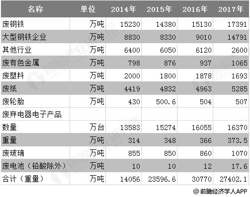 2014-2017年前八大類別再生資源回收總量統(tǒng)計情況