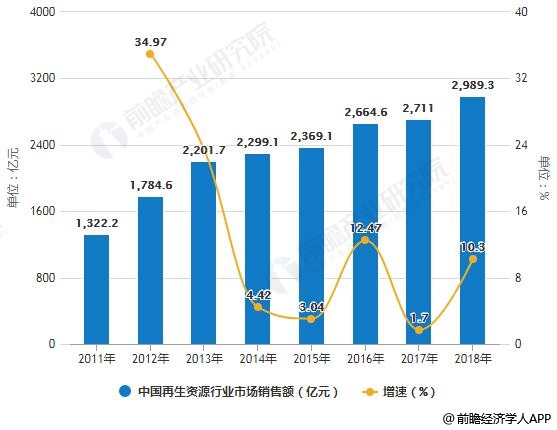 2011-2018年中國再生資源行業(yè)市場銷售額統(tǒng)計及增長情況