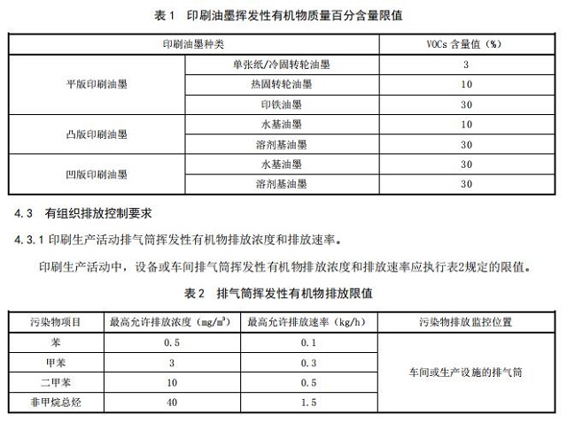 4.2 原輔材料要求 印刷生產(chǎn)活動中使用的印刷油墨揮發(fā)性有機物含量限值(以油墨中揮發(fā)性有機物的質(zhì)量百分含量 計算)應(yīng)執(zhí)行表 1 規(guī)定的限值。