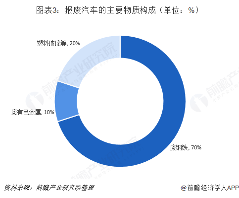 報(bào)廢汽車主要含有黑色金屬、有色金屬、貴金屬(催化劑)、電子設(shè)備、玻璃、車用塑料等。其中,廢鋼等黑色金屬約占70%,銅鋁等有色金屬約占10%,其他物料約占20%。其中廢鋼鐵、有色金屬90%以上都可以回收利用,玻璃、塑料等的回收利用率也可達(dá)50%以上??梢妶?bào)廢汽車的再回收利用價(jià)值較大。