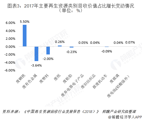 從細(xì)分領(lǐng)域來看,2017年回收量方面,廢電池回收增長(zhǎng)率高達(dá)46.7%,遠(yuǎn)高于其他細(xì)分子行業(yè),僅報(bào)廢機(jī)動(dòng)車和廢塑料回收量出現(xiàn)負(fù)增長(zhǎng)?;厥諆r(jià)值方面,廢鋼鐵、廢有色金屬、廢塑料和廢紙為主要細(xì)分子行業(yè),回收價(jià)值占總值的95%左右,2017年回收價(jià)值占比增長(zhǎng)最多的是廢鋼鐵(+5.5%),下降最多的是廢有色金屬(-3.6%)。