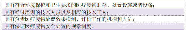 2005年出臺的《醫(yī)療廢物管理條例》中明確規(guī)定,從事醫(yī)療廢物集中處置活動的單位,應當向縣級以上人民政府環(huán)境保護行政主管部門申請領取經營許可證;未取得經營許可證的單位,不得從事有關醫(yī)療廢物集中處置的活動。并且,醫(yī)療廢物集中處置單位,應當符合下列條件:
